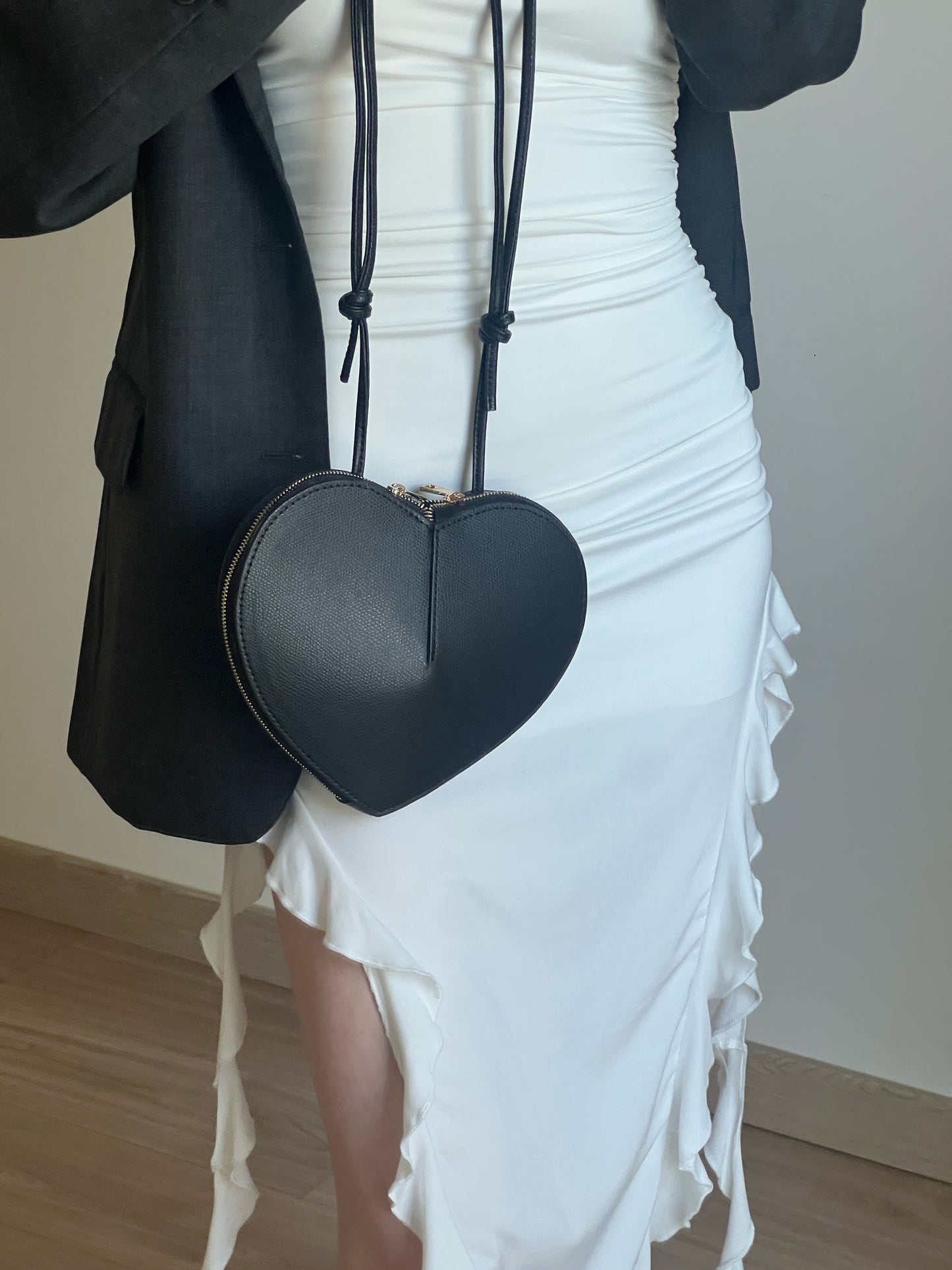Iconic heart shaped bag. With zip closure, adjustable strap. Dimensions: 21 x 17 x 2 cm. It can be worn as shoulder or crossbody bag.