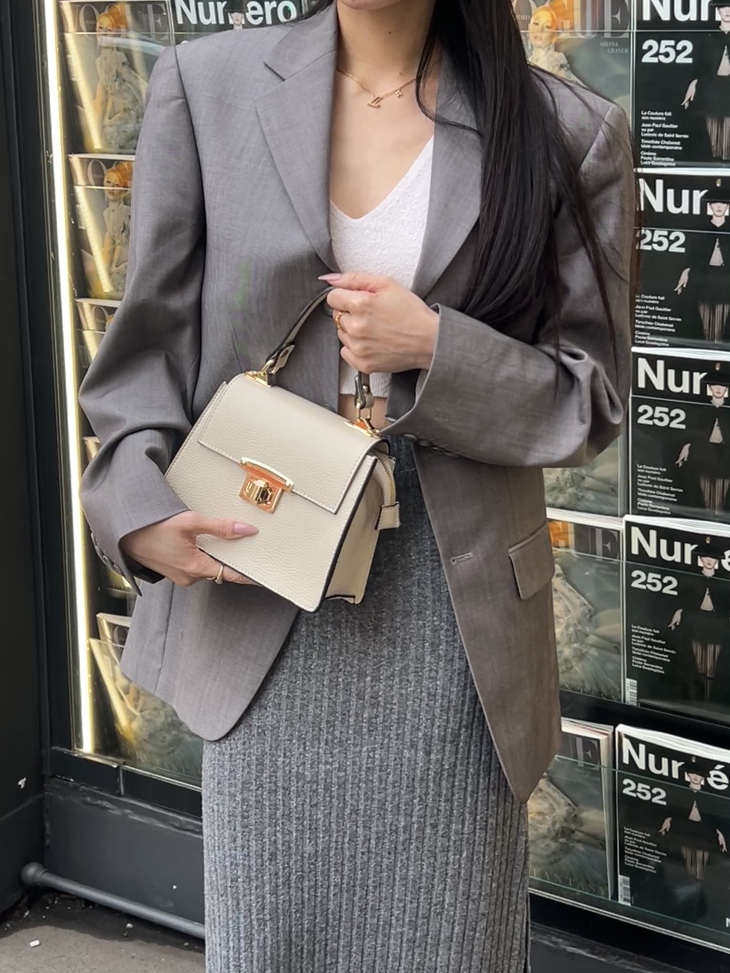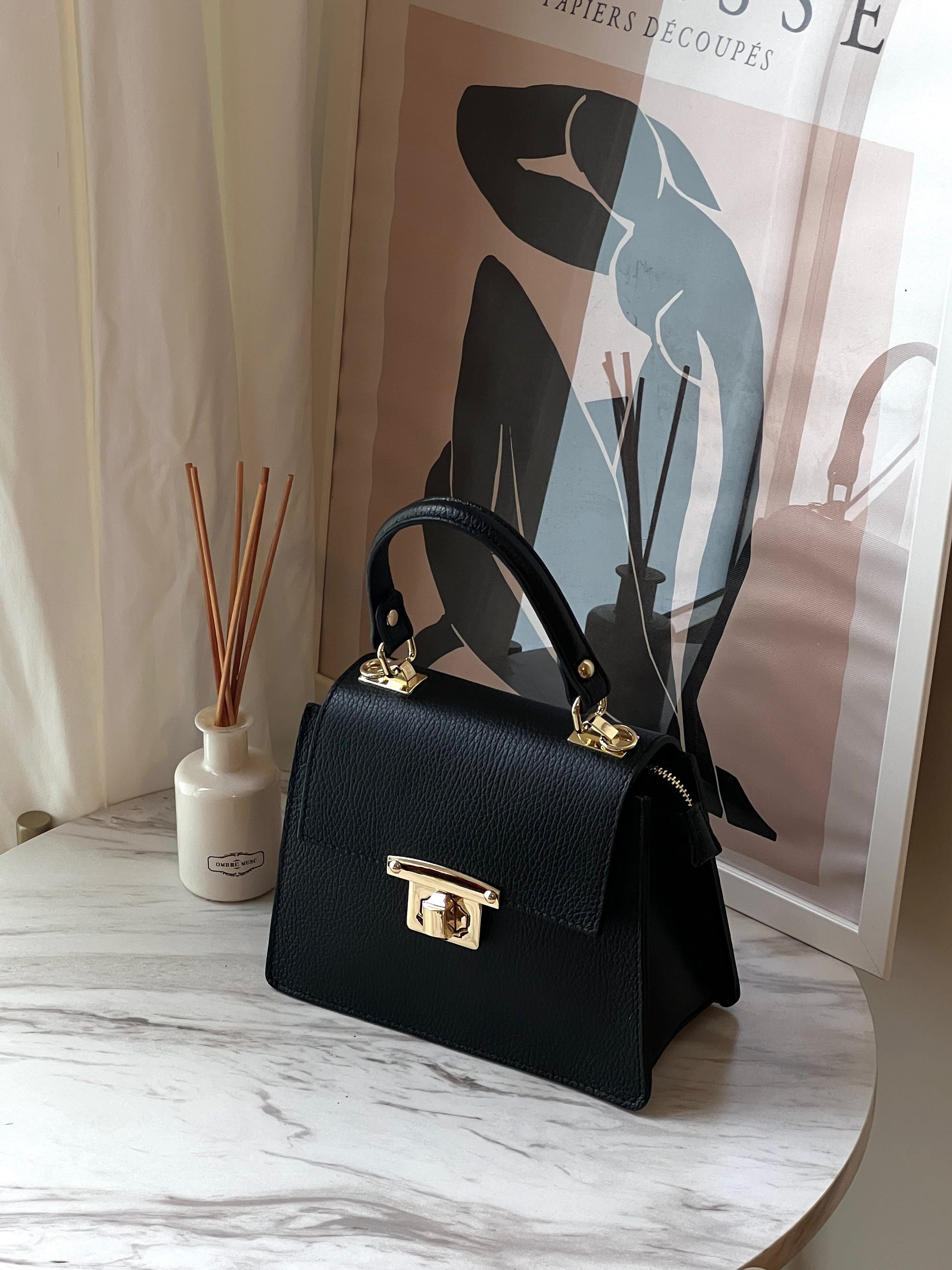 Borsa a mano rigida con manico in pelle, con tracolla in pelle regolabile removibile. Doppia chiusura a girello e zip. Materiale: 100% Pelle di vitello. Accessori metallici in rifinitura oro. Dimensioni: 17 x 22 x 11 cm.